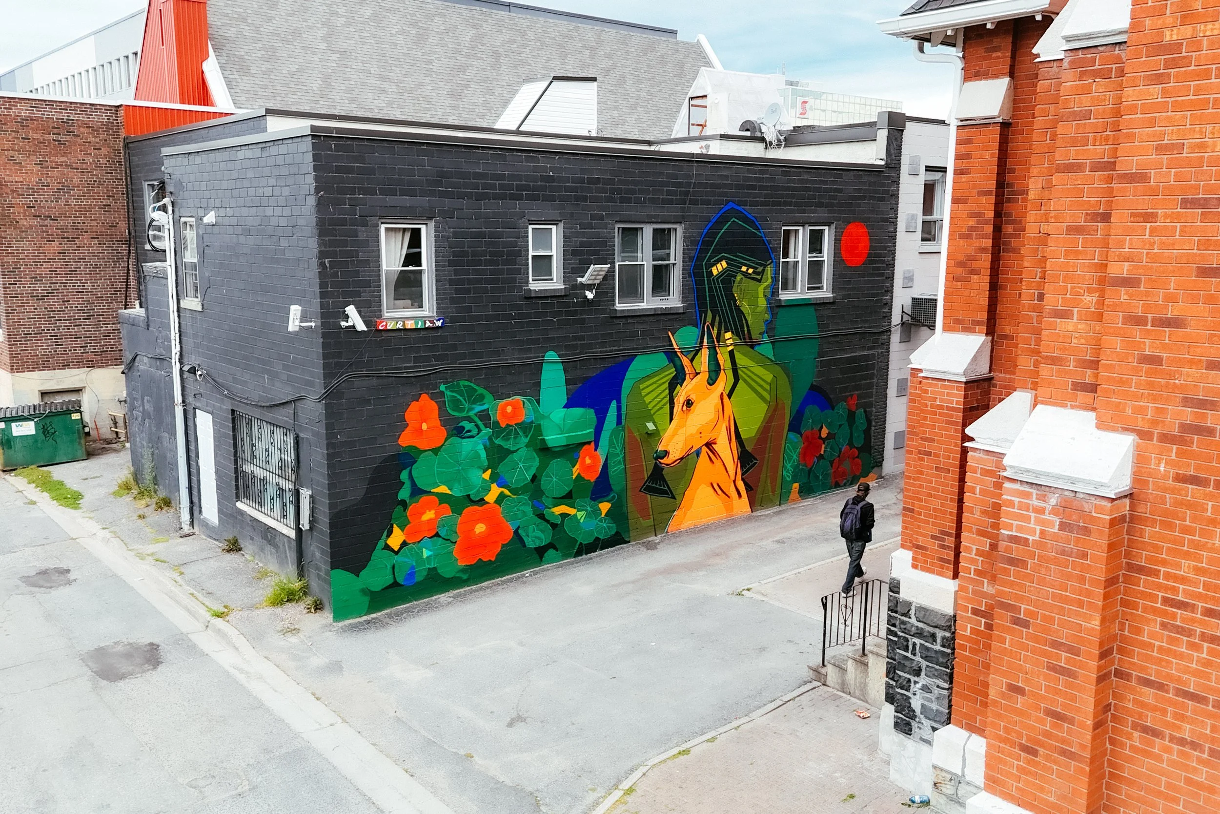 The mural illustrates the protection against harm that aims to enter into your space. With two eyes facing the viewer; one of the woman and one of the canine, they form a united barrier of protection against any potential danger that is lurking.