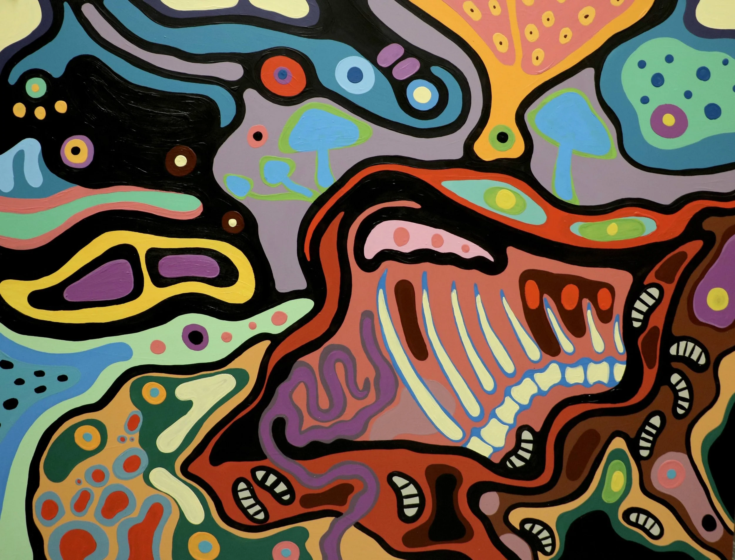 Montreal’s Kezna Dalz doesn’t tiptoe around tough subjects—she dives in, brushes first. Known for her candy-coloured palette and unapologetic voice, Kezna creates work that’s tender, confrontational, and totally her own.